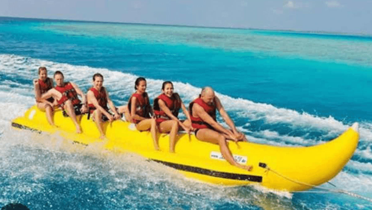 It is a group water activity where riders sit on an inflatable banana-shaped boat pulled by a speedboat.